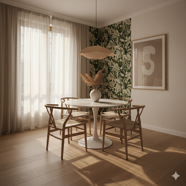 The key to using wallpaper effectively in a small space is restraint of application — one wall, not four. A single feature wall of pattern provides the visual impact of a fully papered room while allowing the three remaining walls to remain neutral, preserving the airiness that small rooms require. The papered wall becomes the room’s focal point, orienting the dining table and the entire composition of the space toward it.