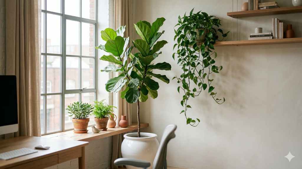 Styling Tip: Choose plants for your studio that genuinely thrive in the light conditions you can offer rather than selecting for appearance alone. A beautiful plant in the wrong light becomes a beautiful dying plant — and a dying plant is the single most depressing element a decorated space can contain. In lower-light studios, ZZ plants, Sansevieria, Pothos, and Heartleaf Philodendrons are among the most forgiving and most beautiful. In brighter studios, the full spectrum of tropical plants becomes available.