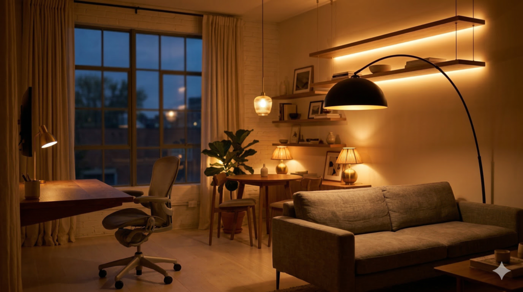 Lighting is, without question, the single most transformative and most underestimated element of interior design at every scale — but in a small studio apartment, its importance is amplified considerably. Overhead lighting alone, particularly the harsh, flat quality of a single central ceiling fixture, destroys the atmosphere and perceived scale of a small space faster than any other single factor. The solution is layered lighting: multiple light sources at different heights, temperatures, and intensities that create depth, warmth, and visual dimension throughout the room.