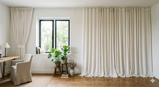 Curtain placement is one of the most commonly under-optimised decisions in small apartment decorating, yet its impact on the perceived scale and elegance of a room is disproportionate to the simplicity of the intervention. Standard curtain hanging — placing the rod at the window frame and using curtains sized exactly to the window width — makes windows look smaller, ceilings look lower, and rooms feel more constrained.