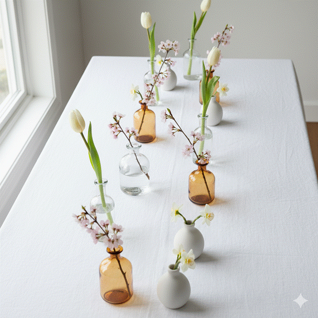A collection of bud vases — small individual vessels each holding one or two stems — has emerged as one of the most refined and versatile spring centerpiece ideas for modern dining tables. Rather than one large arrangement, the bud vase collection creates a composed tableau that runs the length or breadth of the table in a way that invites conversation and allows every guest an intimate view of the blooms.