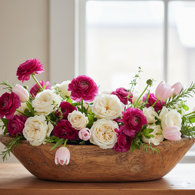 Fill the dough bowl with floral foam or a layer of damp moss and tuck in a low, abundant arrangement of spring blooms — ranunculus, garden roses, tulips, and small-leafed herbs. The wide rim of the bowl allows an arrangement that spreads laterally across the table rather than reaching upward, creating a sense of generous abundance that feels entirely in keeping with the spirit of the season.