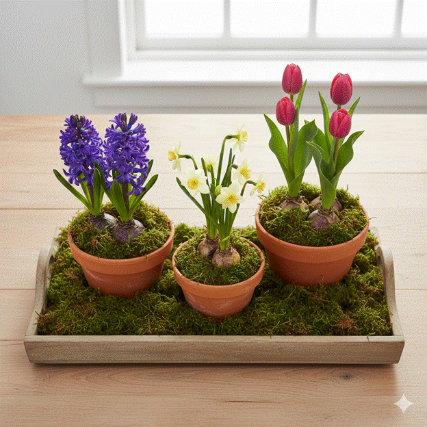 Styling Tip: Force hyacinth bulbs in glass bulb vases — the transparent vessel shows the white root system developing below the waterline, creating a second layer of botanical beauty beneath the bloom above. A cluster of three bulb vases in different heights beside a moss-filled tray of tulip pots creates a centerpiece of genuine design sophistication.