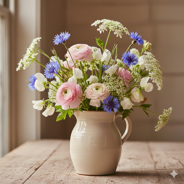 Choose a vessel that enhances rather than competes — a handthrown ceramic jug in soft ivory, sage, or warm terracotta allows the flowers to be the undeniable subject. Mix cornflowers, ranunculus, sweet peas, and cow parsley for a composition of colour, texture, and scale that changes with every viewing angle. The key is restraint in the vessel and abundance in the blooms.
