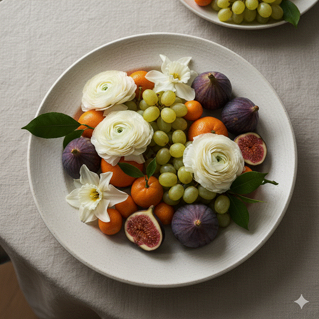 Styling Tip: Choose fruit that is at its visual peak but not yet overripe for use as a table decoration — the bloom on a fresh fig, the deep colour of ripe grapes, and the smooth skin of an unblemished apple all contribute to the overall beauty of the arrangement. Refresh the fruit element every two to three days as the composition evolves, eating what is replaced.