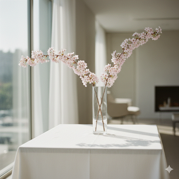 The height of cherry blossom branches gives them a quality that low arrangements cannot — they arch gracefully over the table, their blossoms catching light from above and casting delicate petal shadows on the surface below. They bring the canopy of spring indoors and create, even in the most urban of dining rooms, the sensation of sitting beneath a flowering tree.