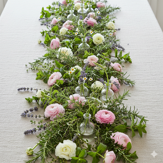 A table runner composed of fresh herbs and spring flowers is one of the most dramatic and sensory-rich spring centerpiece ideas available — and it requires no vase, no foam, and no significant floristry skill to achieve. Laid directly on the table surface or on a length of linen runner, an abundant composition of rosemary, lavender, thyme, mint, and spring blooms creates a living tableau that perfumes the air and transforms every meal into an occasion.