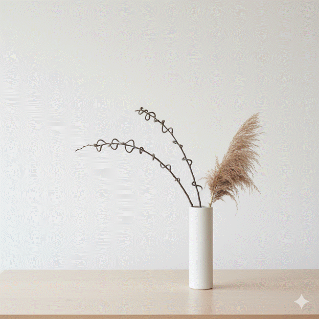 Curly willow, contorted hazel, or flowering quince branches placed in a tall cylindrical vase with a single elegant feather or a stem of dried pampas grass create a centerpiece of quiet drama and considered restraint. In a spring context, the bare or lightly leafing branches capture the precise transitional quality of the season — not yet fully in leaf, carrying the promise of what is coming rather than the fullness of what has arrived.