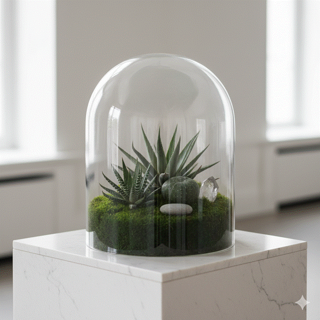 Styling Tip: Introduce a single unexpected element into the terrarium — a small piece of quartz crystal, a tiny ceramic figure, a smooth river pebble — to give the miniature landscape a personality and a focal point. Mist the moss lightly every three to four days and place in bright indirect light to keep both the moss and the succulents in optimal condition.