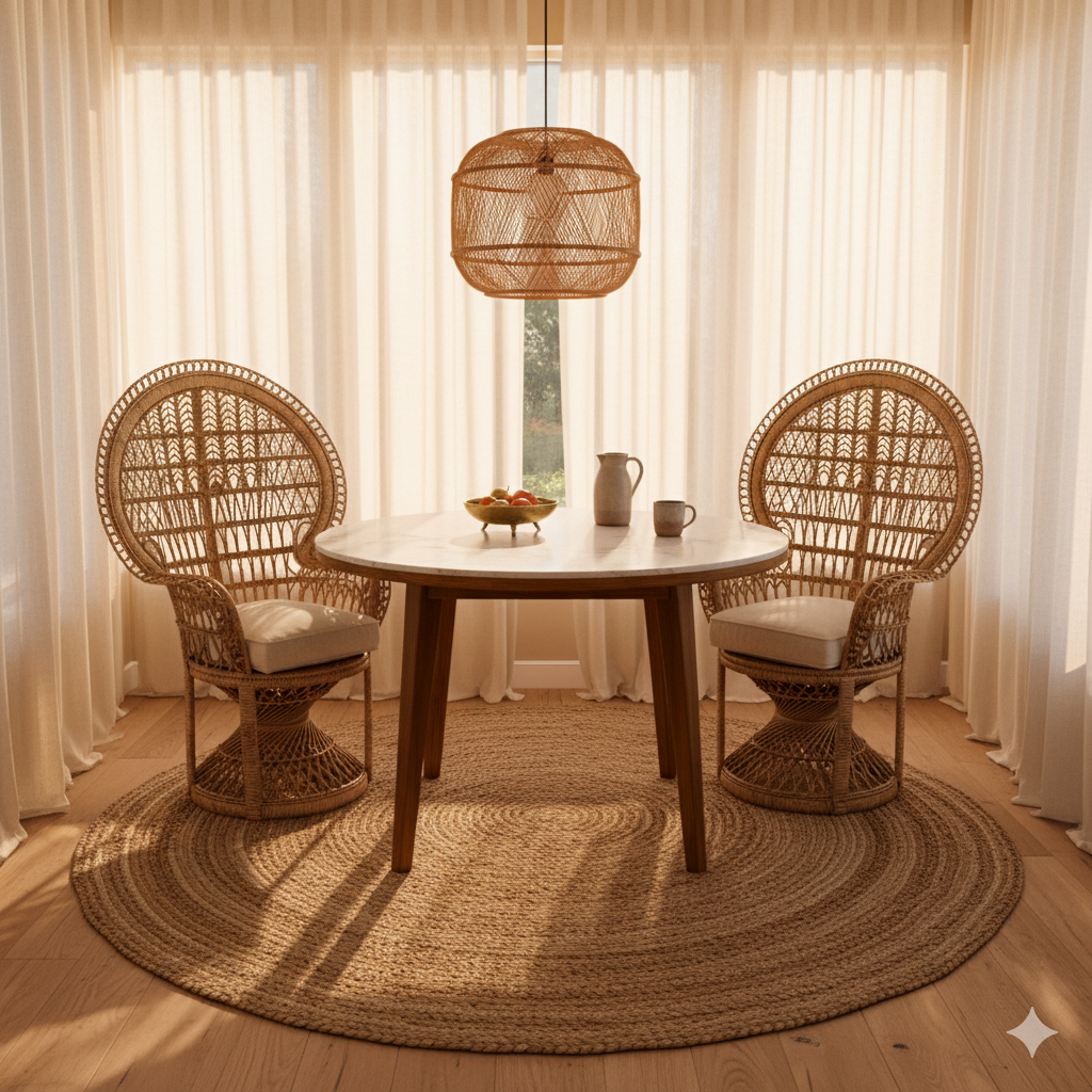 Choose tulip-shaped rattan chairs or peacock chairs for a more dramatic silhouette. Pair them with a round marble or teak tabletop. Add a jute rug beneath the seating arrangement and hang a rattan or bamboo pendant light above for a cohesive, material-rich composition.