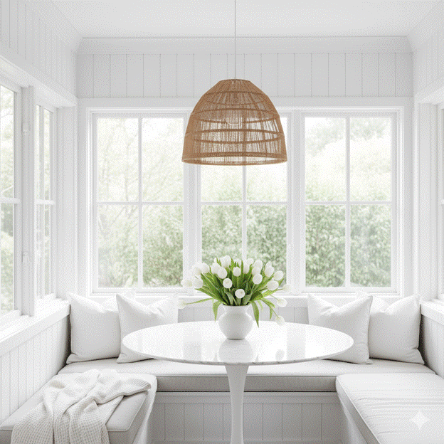 White remains one of the most powerful colors in interior design — not because it is simple, but because it amplifies light in ways no other palette can. An all-white sunroom breakfast nook feels expansive, fresh, and endlessly elegant.