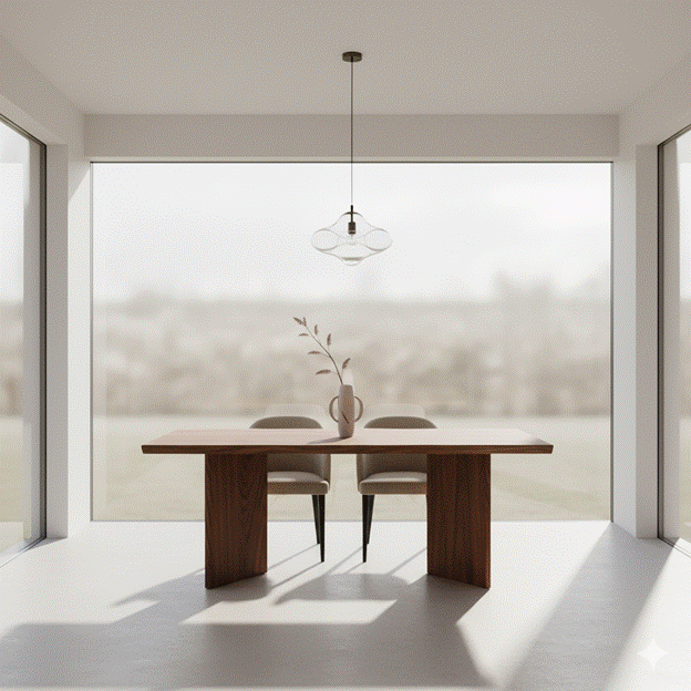 Choose furniture in natural materials with simple silhouettes — a solid oak or walnut table with a live-edge detail, paired with molded plywood or slim-profile upholstered chairs. Keep the color palette to two or three neutral tones: warm white, soft greige, and the natural wood tone of the furniture itself.