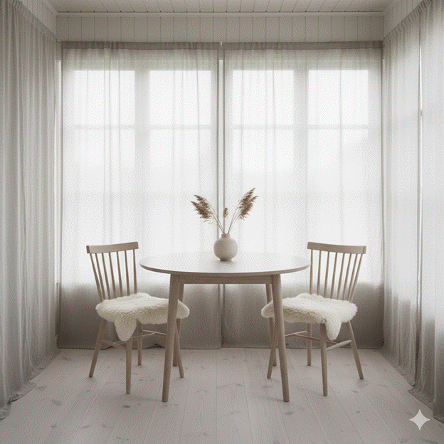 In a Scandinavian nook, the most important design element is the quality of the natural light. Keep windows completely unobstructed or dress them with sheer, gauzy linen panels that diffuse rather than block light. Morning sun filtered through linen creates an ethereal, soft glow that no artificial lighting can replicate.