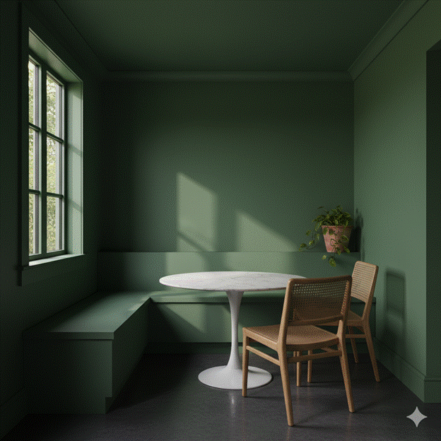 Deep sage green, moody teal, dusty terracotta, or warm blush are all exceptional choices for a color-drenched sunroom nook. When a single color wraps every surface, the space feels simultaneously bold and harmonious, with natural light playing across the tonal variations beautifully throughout the day.