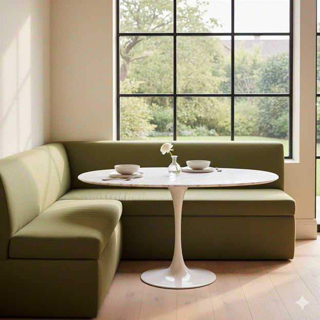 For a sunroom, choose banquette upholstery in performance fabrics that resist fading — look for solution-dyed acrylic in linen, sage green, or warm cream tones. Add a round or oval pedestal table to soften the geometry of the corner seating and improve flow around the space.