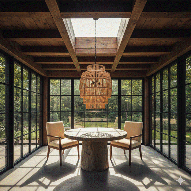 Few materials feel as inherently suited to a sunroom as rattan and wicker. Their natural, woven textures reference the outdoors while remaining genuinely comfortable and visually sophisticated. In a breakfast nook setting, rattan chairs paired with a solid wood table create an effortlessly warm aesthetic.