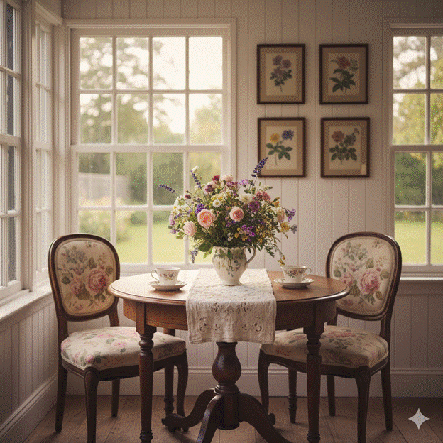 Choose a round or oval wooden table with turned legs and pair it with mismatched vintage chairs reupholstered in floral or gingham fabric. Hang botanical prints in simple wooden frames. Style the table with a vintage-inspired ceramic vase filled with garden flowers, a linen runner, and delicate bone china.