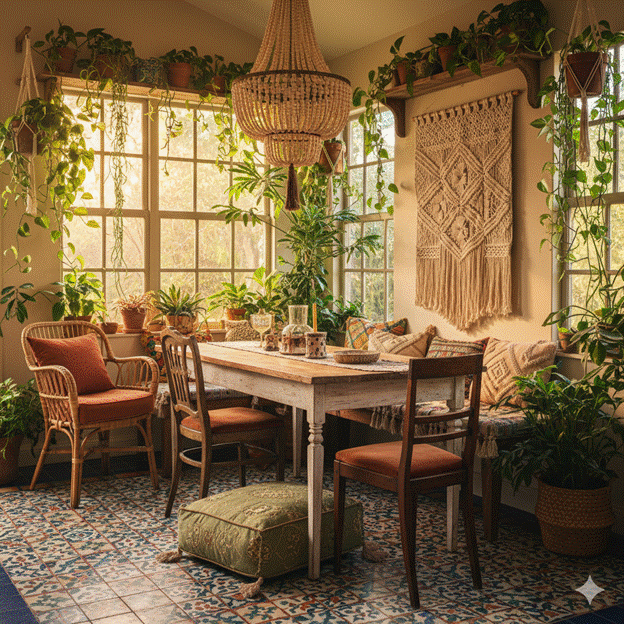 Layer Moroccan-inspired tiles on the floor beneath a mismatched mix of rattan and upholstered chairs. Hang a macrame wall hanging beside the window. Mix patterned cushion covers in terracotta, rust, and sage. Add a low-hanging beaded chandelier and fill every surface with potted succulents and trailing plants.