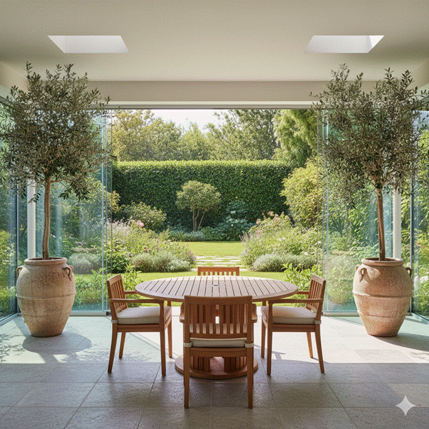 Choose weather-resistant yet beautiful indoor-outdoor furniture — teak tables with linen cushions, powder-coated metal chairs with woven seats. Use large-format stone or concrete-look tiles on the floor to reference exterior paving. Add potted olive trees or bay laurel in terracotta urns. Keep one glass wall or door panel open to the garden during morning hours to allow the breeze and birdsong in.