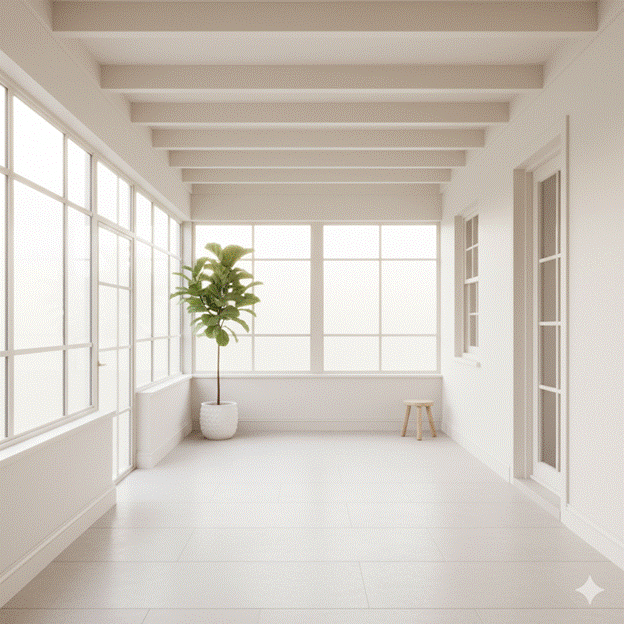 The choice between a warm or cool white is particularly important in a sunroom entryway where the colour of the incoming natural light changes throughout the day. Warm whites with undertones of cream or yellow complement morning and afternoon sun beautifully; cool whites with faint blue or grey undertones read most elegantly in overcast north-facing rooms or in climates with clear, bright light.