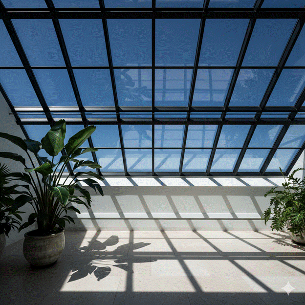 A full glass roof over the sunroom entryway — supported by slim structural ribs in steel or aluminium — creates the sensation of standing in an indoor garden. Rain on the glass above adds a fourth sensory dimension. A single large rooflight over a dark corner of the entry transforms it into the brightest and most beautiful point in the space with a single architectural gesture.