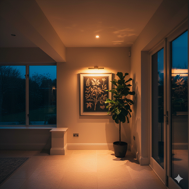 Begin with ambient light at ceiling level — recessed downlights at regular intervals provide an even base light that activates the whole space after dark. Add accent lighting to illuminate specific features: a picture light over artwork, an uplighter behind a large plant that casts dramatic botanical shadows on the wall and ceiling, or a low-level pathway light along the floor beside the glazed wall.