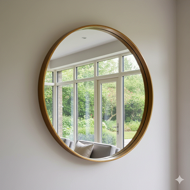 Styling Tip:  Position the mirror at a height where it reflects the most visually interesting element of the room — ideally a view of the garden or greenery through the windows, or the light quality of the sky above. A mirror that reflects light and nature rather than a blank wall or the ceiling multiplies the beauty of the space rather than simply its brightness.