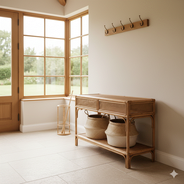 A rattan console table with an open shelf for baskets, a woven seagrass mirror frame, a bamboo umbrella stand, or a natural timber coat rack — each of these pieces introduces the textures and tones of the natural world in a material vocabulary that belongs perfectly in a light-saturated sunroom environment. They also age gracefully, developing character rather than showing wear.