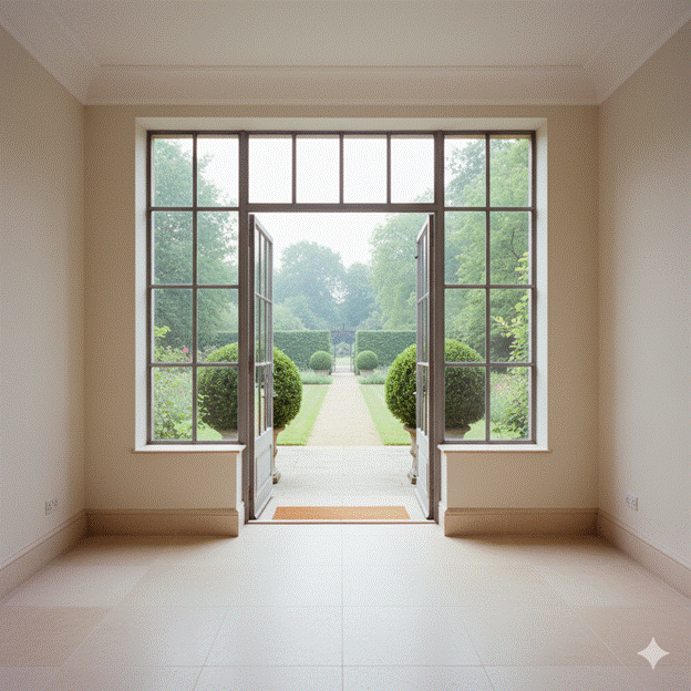 Styling Tip:  Consider the threshold detail as carefully as the door itself — a smooth, flush sill with no trip hazard and a material transition between exterior and interior flooring that is deliberate rather than abrupt creates an arrival experience of seamless, considered quality. A recessed mat well with a fitted natural coir mat keeps the floor pristine and the aesthetic cohesive.