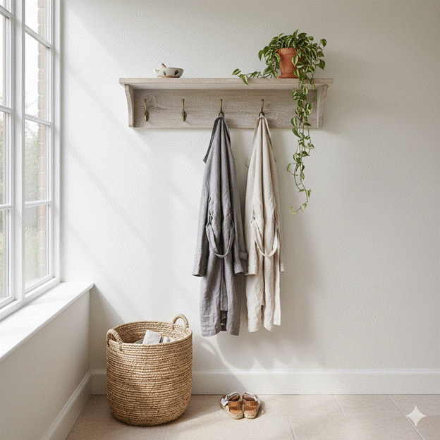 A wall-mounted system of hooks, narrow shelving, and woven baskets in natural materials creates a storage solution that is organised, beautiful, and entirely in keeping with the sunroom aesthetic. A floating shelf at height for keys and a small bowl for pocket items, hooks in aged brass or matte black for coats, and a low open basket for shoes keeps the floor clear and the visual noise minimal.