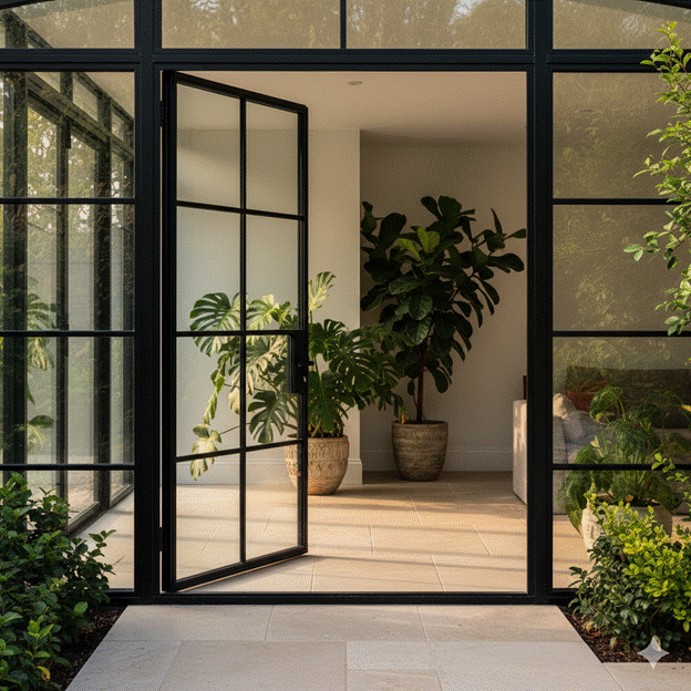 The doors of a sunroom entryway are its first and most defining architectural element — and bespoke glazed doors in steel, timber, or aluminium frames elevate the entry from a functional opening into a genuine design statement. Wide bifold or pivot doors that fold or swing entirely clear of the opening create a threshold experience of remarkable drama and openness.