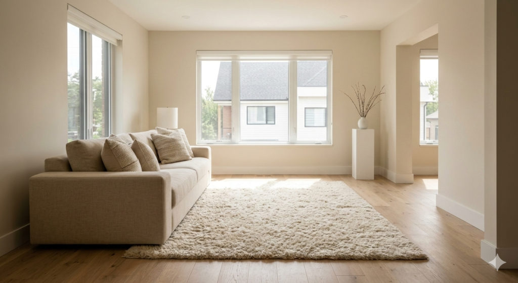 Styling tip: Layer similar tones throughout the room—linen sofas, wool rugs, and light wood furniture—to create depth while maintaining a peaceful palette.
