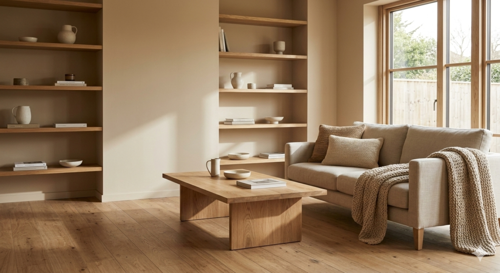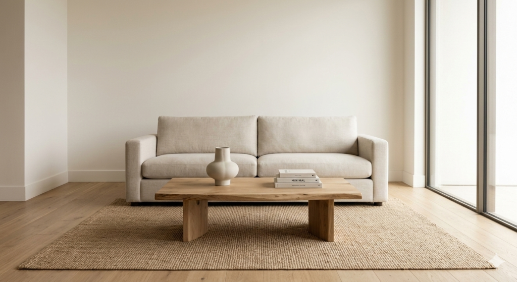 Coffee tables, console tables, floating shelves, or exposed wood beams introduce subtle texture and character.