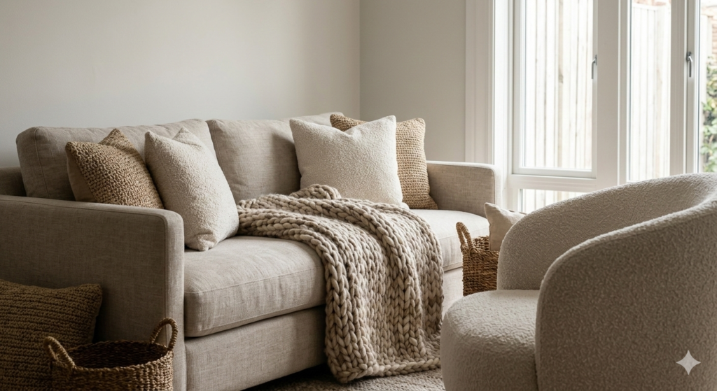 Linen sofas, boucle armchairs, wool throws, and cotton cushions create visual interest while maintaining simplicity.