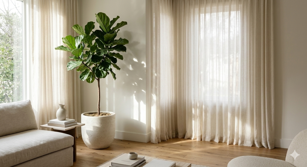 Large plants such as fiddle leaf figs, olive trees, or rubber plants make elegant focal points in living room corners.