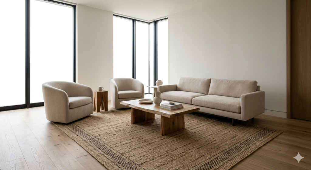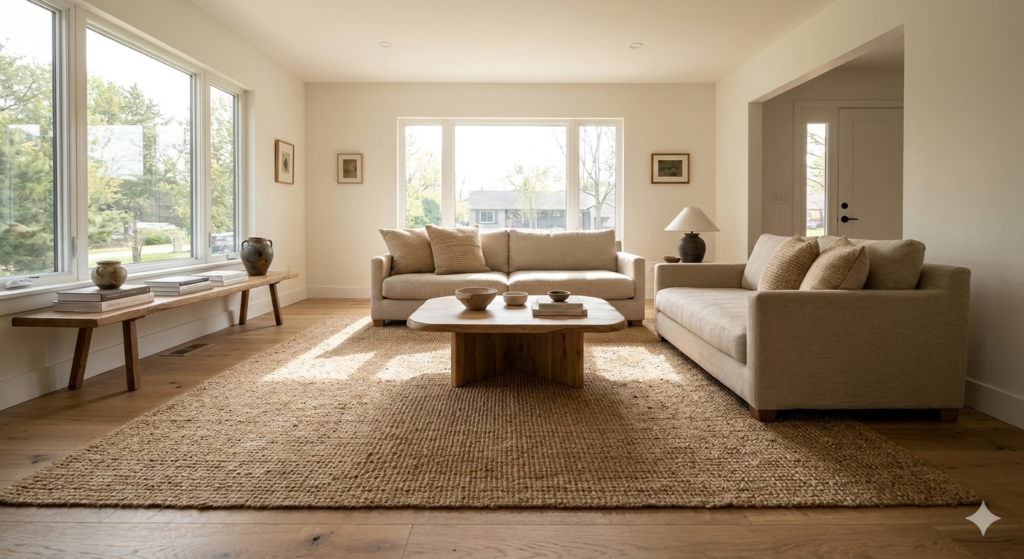 Rugs made from natural materials enhance the organic feel of a living room. Jute, wool, and woven cotton rugs introduce warmth and texture.