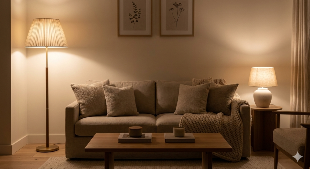 Styling tip: Choose warm lighting and lamps with natural materials such as linen shades, ceramic bases, or wooden accents.