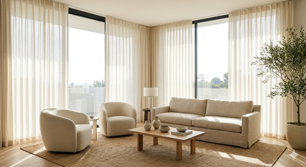 Organic modern spaces celebrate natural light. Large windows, sheer curtains, and uncluttered layouts allow daylight to become part of the design.