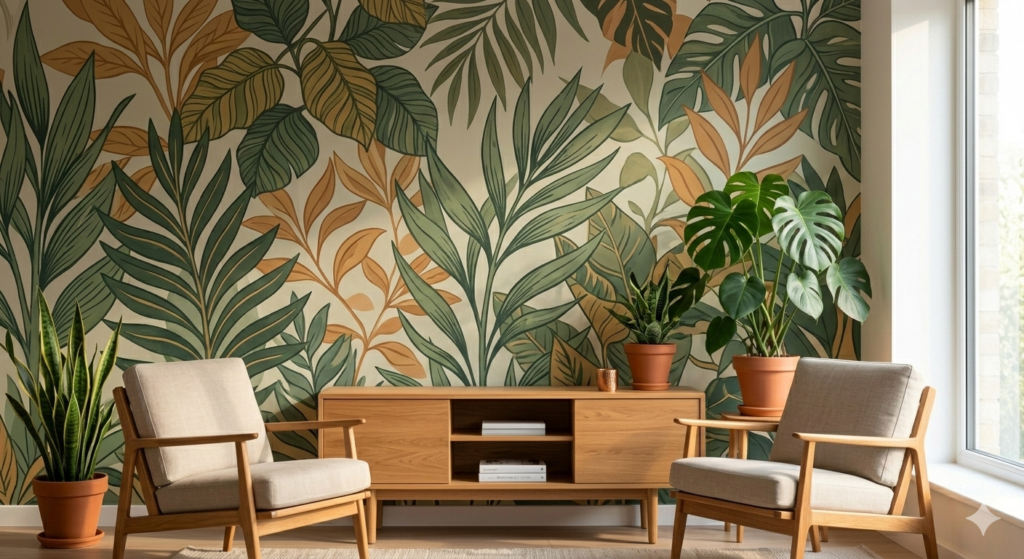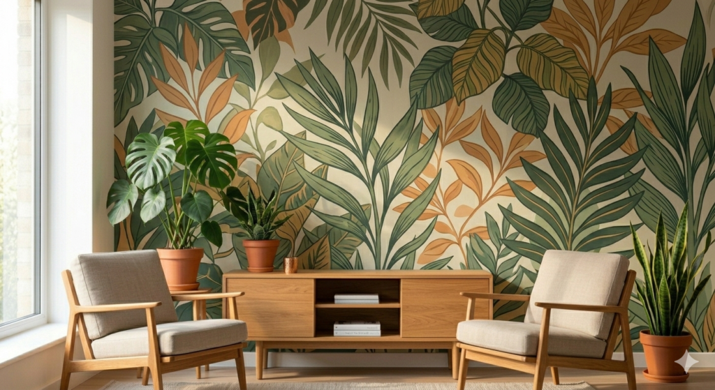 Bring the outdoors inside with botanical or landscape murals. Colors: earthy greens, warm ochres, or soft blues. Texture: matte or slightly textured paint. Tip: Complement with indoor plants and wooden furniture to enhance harmony.