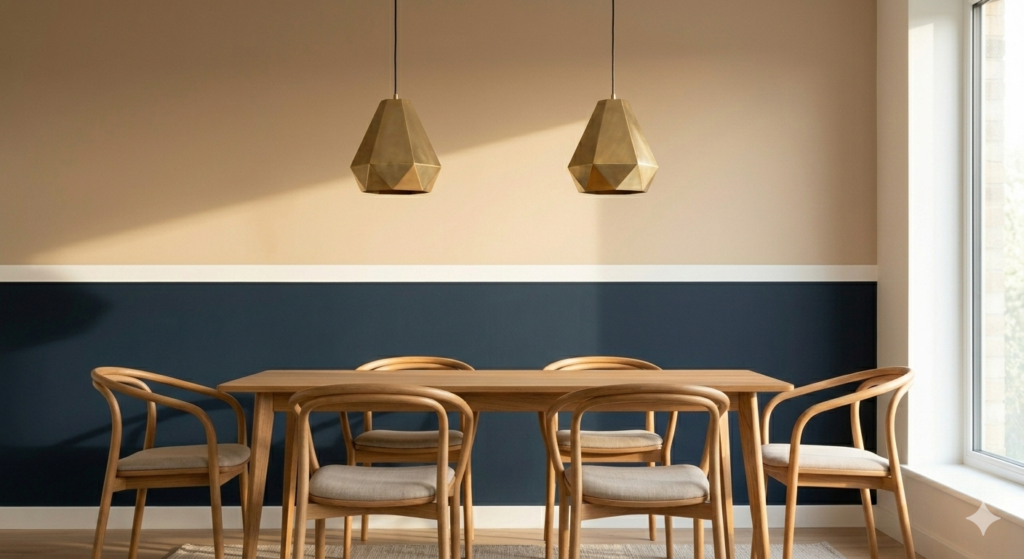 Combine complementary shades, e.g., soft beige and deep navy. Use a crisp dividing line horizontally or vertically. Tip: Use lighter shades on top to open space. Add subtle textures like wainscoting or molding for sophistication.