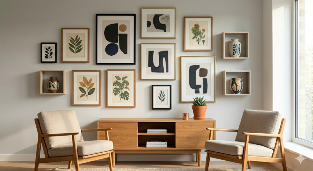 Display curated art, photographs, or prints. Colors: choose cohesive frames and wall tones to unify. Tip: Mix frame sizes but maintain consistent spacing. Lighting: wall-mounted picture lights enhance artwork details.
