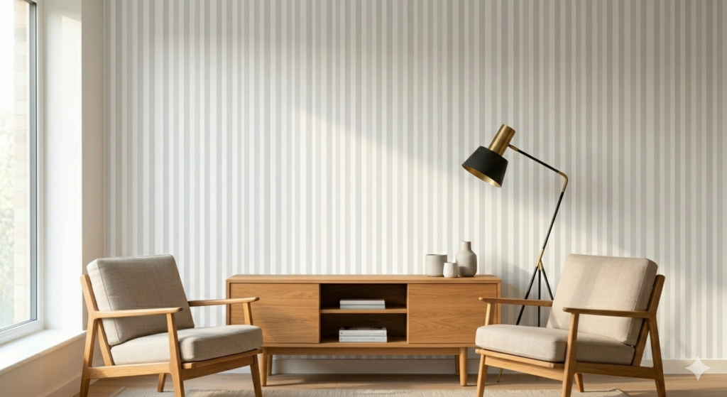 Vertical stripes elongate walls, horizontal stripes widen space. Colors: soft contrasts or bold combinations. Tip: Use matte and gloss finishes together for subtle sophistication. Styling: Keep furnishings minimal to avoid competing with stripes.